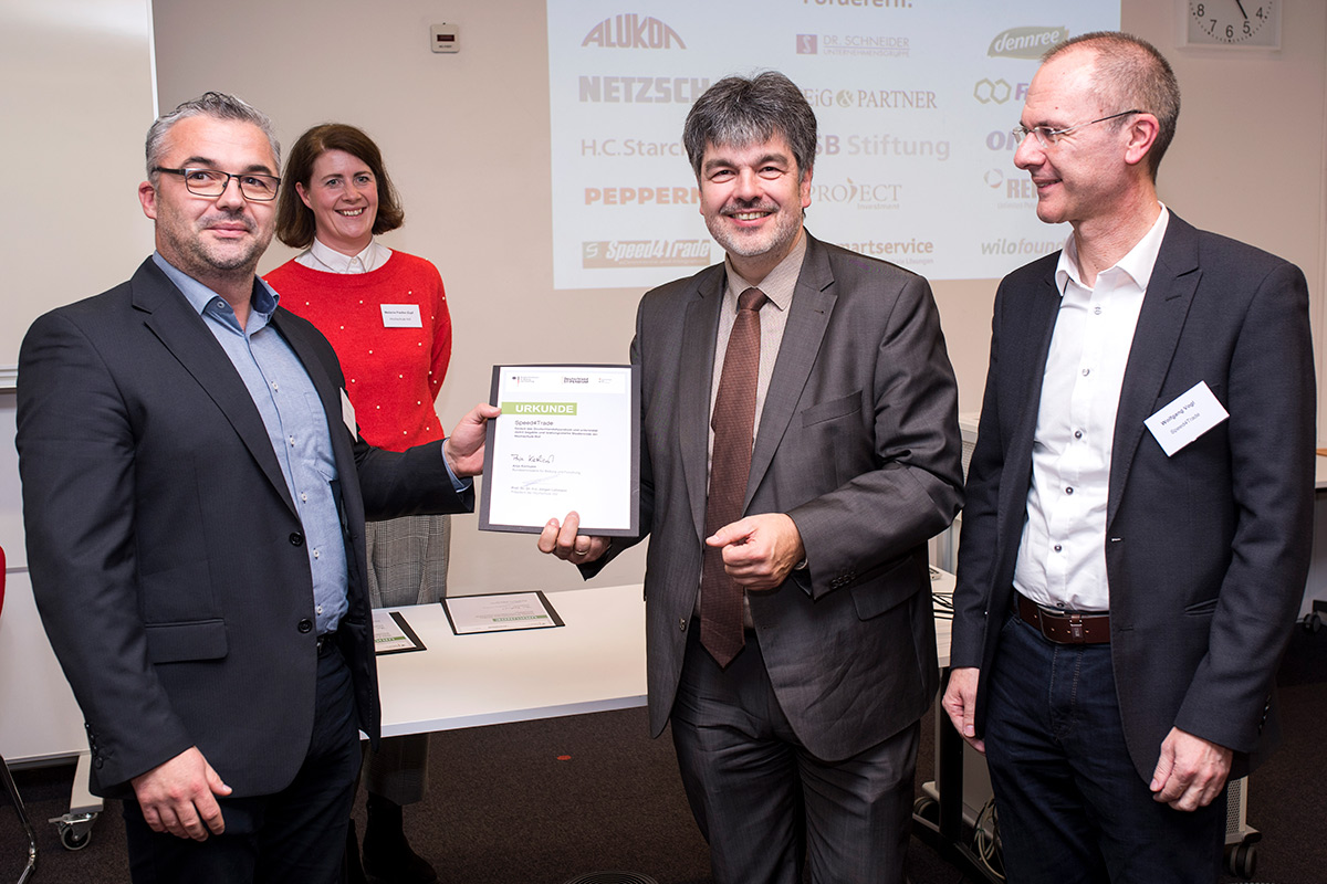 Die beiden Deutschlandstipendien, die Speed4Trade stiftet, erhalten Sebastian Blümel und Mahmut Jomaa. Die beiden jungen Stipendiaten belegen an der Hochschule die Studienrichtung „Master Internet Web Sciences“. Speed4Trade-Geschäftsführer Sandro Kunz und Wolfgang Vogl, Director Business Development von Speed4Trade, gratulierten Sebastian Blümel und Mahmut Jomaa vor Ort persönlich zu ihren „Deutschlandstipendien für begabte und leistungsstarke Studierende“.