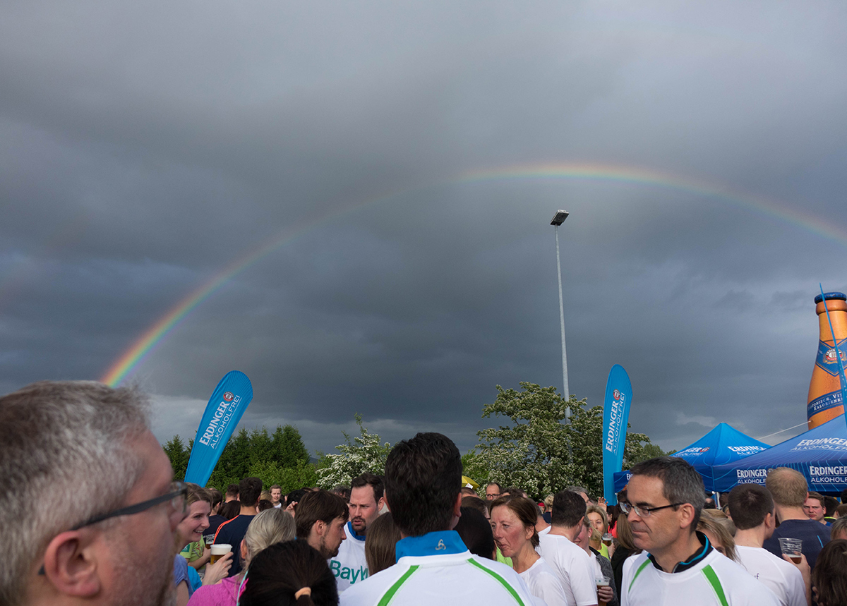 Als am Ende die über 7.000 Läufer die Ziellinie passierten, machten sich Stolz und Erleichterung breit. „Wie bestellt“ wurden die Läufer dann auch noch von einem Regenbogen über Kemnath belohnt. Die Teilnehmer können in der Tat stolz auf ihre Leistung und ihr Durchhaltevermögen sein. Unabhängig von den guten erzielten Zeiten kamen alle „Speed4Trade’ler“ wohlbehalten ins Ziel. Bei reichlich Nudelsalat und Chilli konnten sich alle Läufer von den Strapazen erholen und schnell wieder zu Kräften kommen.