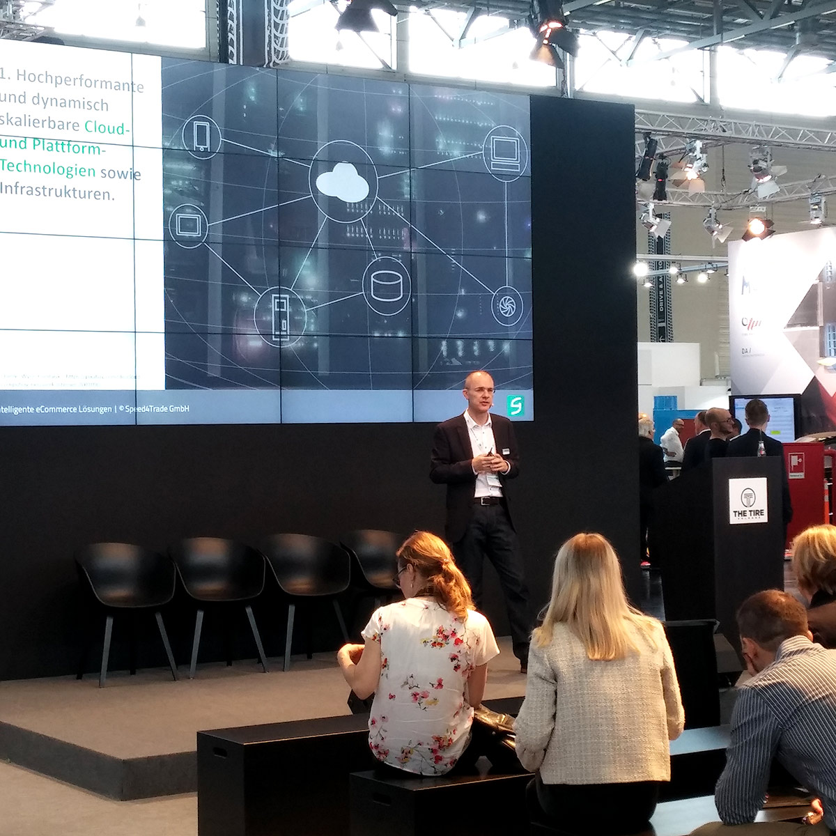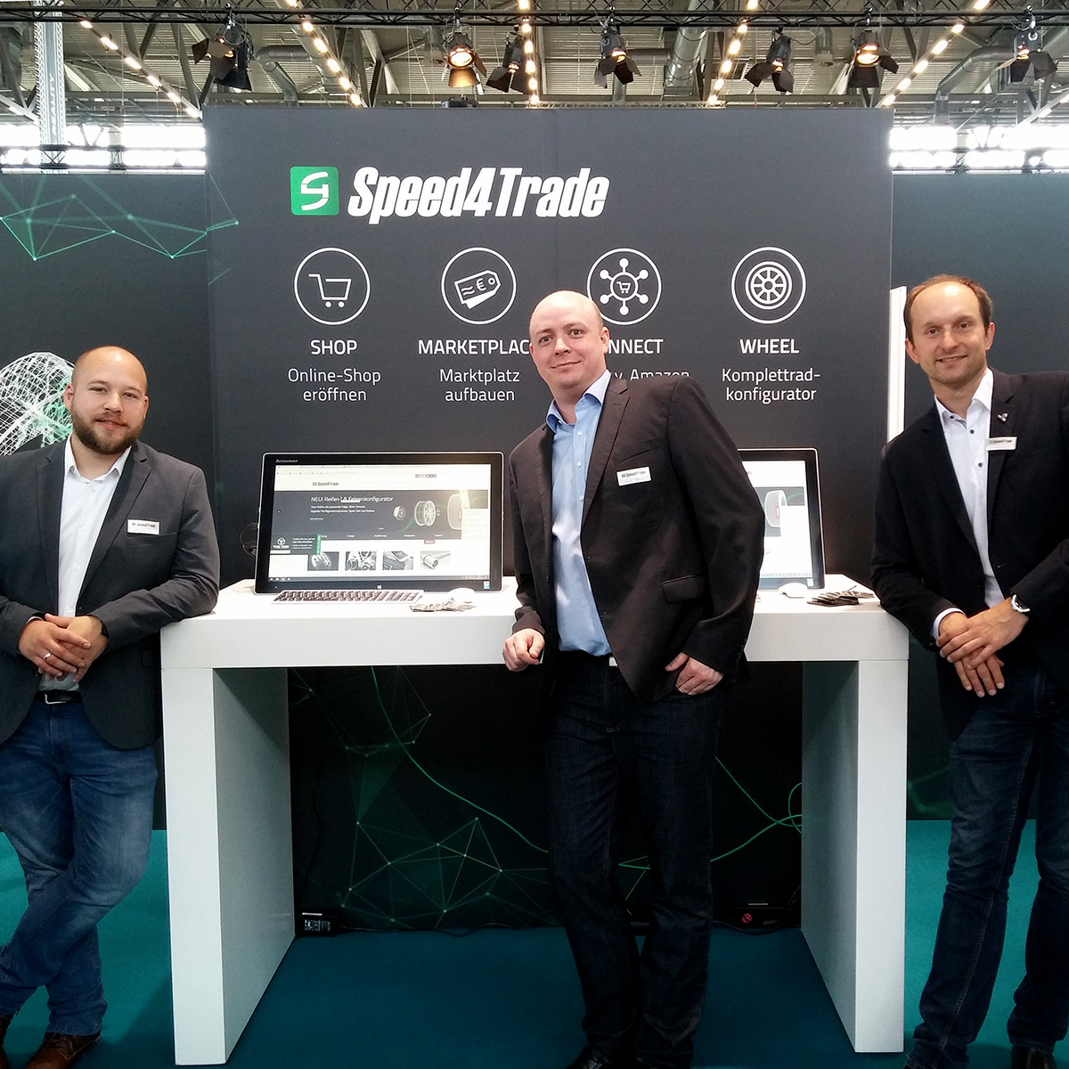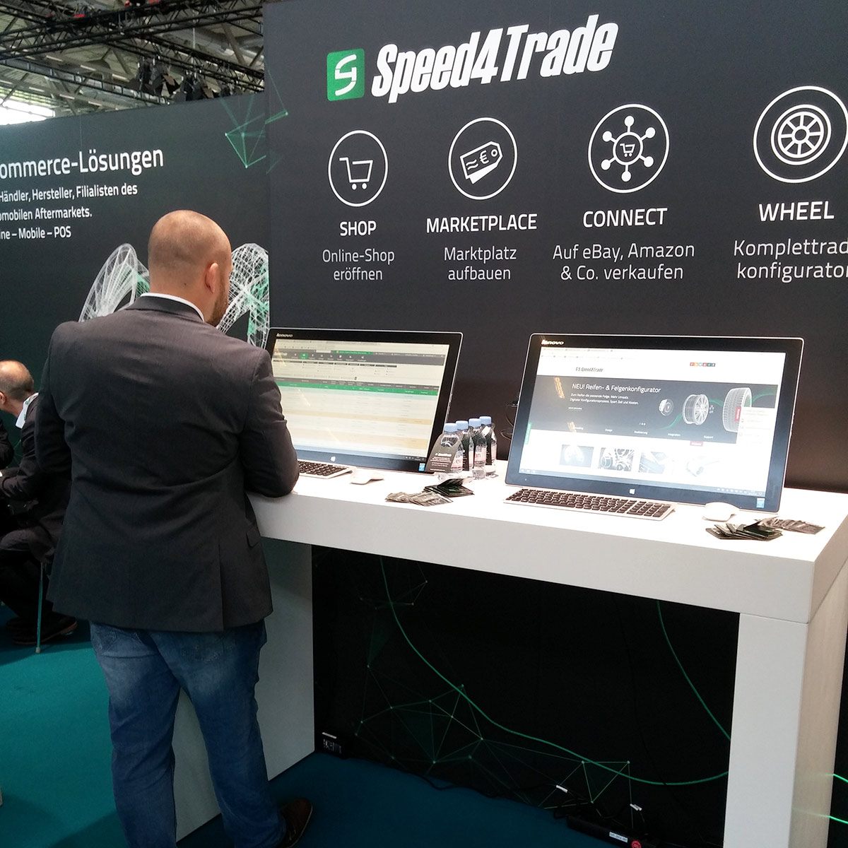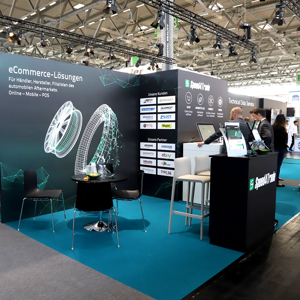 Im Fokus des Standbesucher-Interesses stand mit Speed4Trade WHEEL ein mit modernster Cloud-Technologie arbeitender Reifen- und Felgenkonfigurator. Die Lösung kann in Online-Shops und von Werkstätten oder Autohäusern als Touchscreen-Terminal-Lösung für Beratung und Verkauf eingesetzt werden. Die Besucher probierten am Stand selbst aus, wie Reifen und Felgen am virtuellen Fahrzeug dargestellt werden und wie die Zuordnung Fahrzeug-Reifen-Felge-RDKS funktioniert. Die Frontend-Komponente des Konfigurators lässt sich flexibel in jede B2B- oder B2C-Reifen-Plattform und in jedes Shopsystem integrieren und nach Wunsch individuell erweitern.